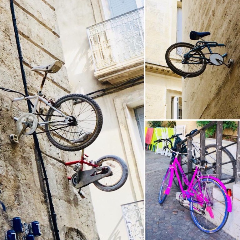 Philippe told us about a street artist,ย Monsieur BMX, whose drawings of choice used to be bicycles – pictures of bikes, wheels of bikes, skid marks of bikes. However, he apparently wasnโt very good at street artist-ing, because his group told him that he could no longer use their signature when he painted in old town, so in retaliation to this insult, he simply mounted half of an actual bike to the wall….PEOPLE LOVED IT. He is now widely revered throughout the city. You can be sure that, if you see half of a bike on the wall, the other half is somewhere close by. He is one of Montpellier’s favorite artists.