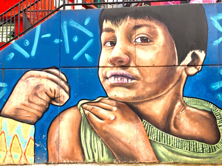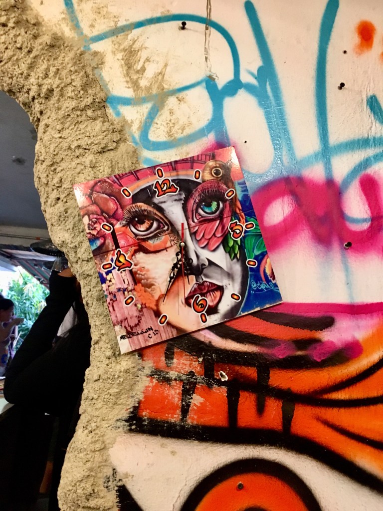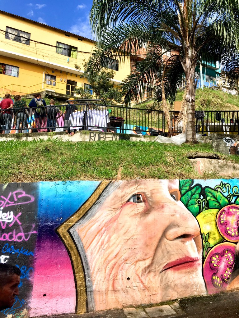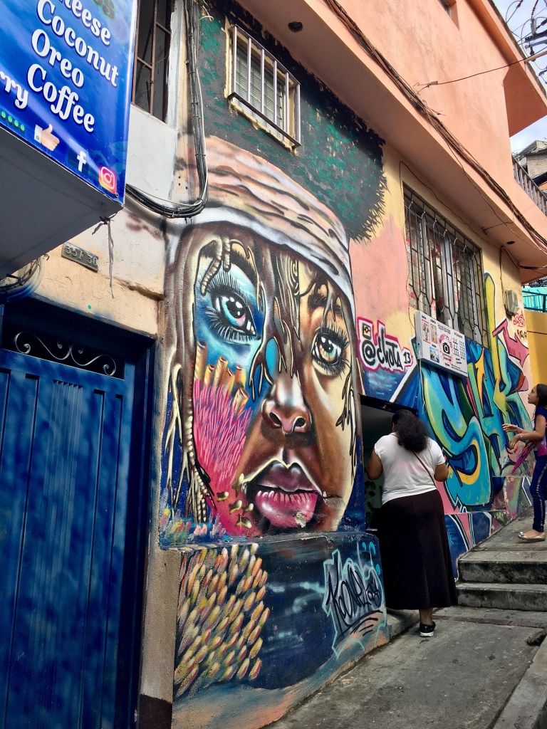 Our guide brought us to a popsicle shop, where they sold frozen fruit in plastic cups. Super, super sweet chunks of mango and passion fruit, doused in a squirt of incredibly tangy saltwater. The people in Comuna 13 have gotten popsicles here for as long as they can remember, making this shop one of the few places of peace in a city surrounded by uncertainty. The girl painted onto the shop’s wall became the face of hope for a peaceful and safe future for this vibrant community. She is now the face of Comuna 13.