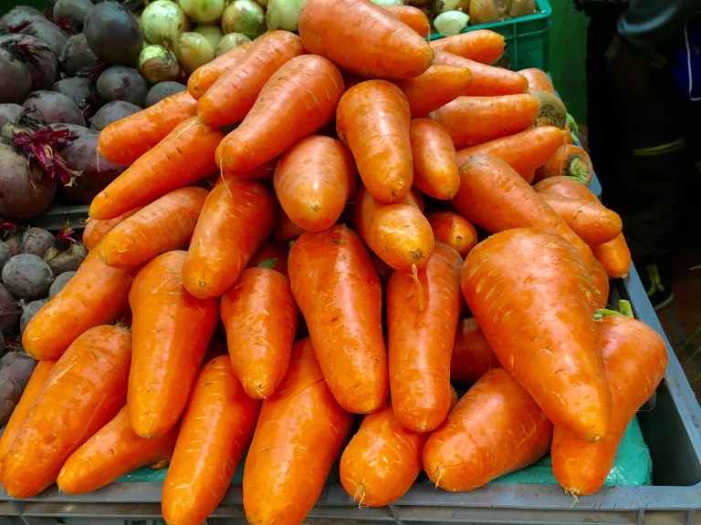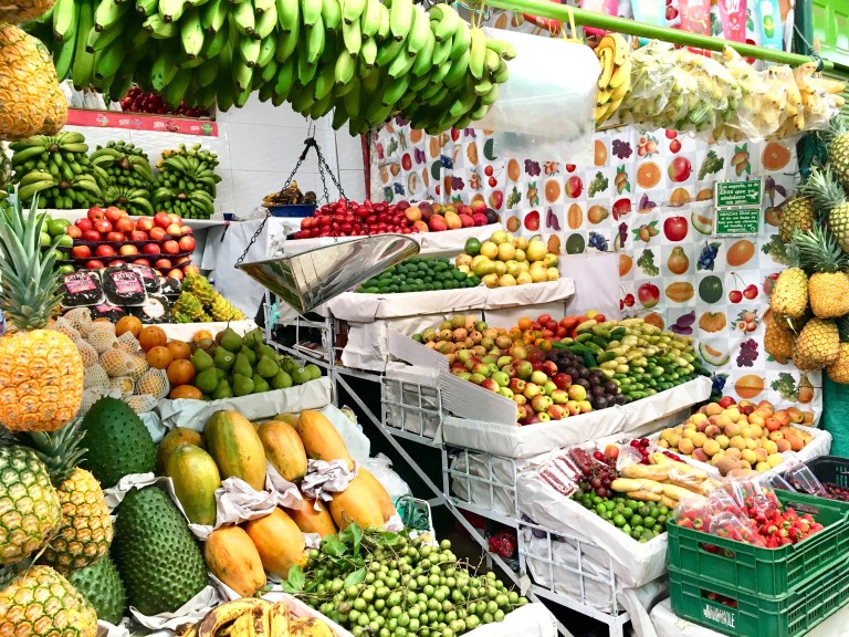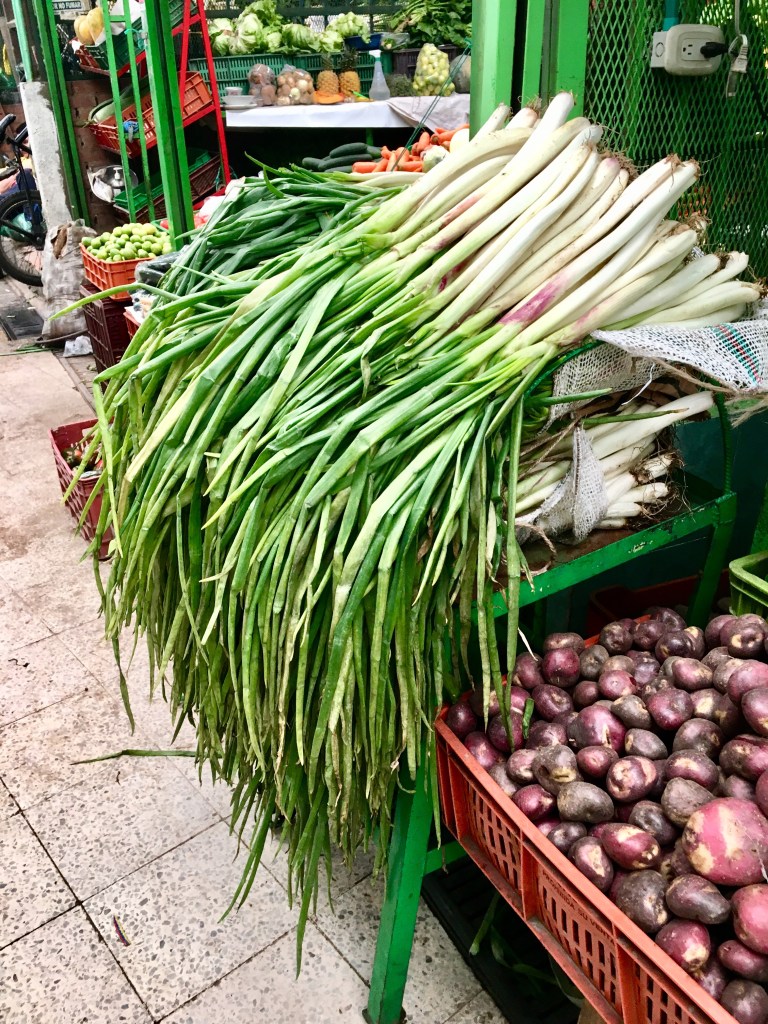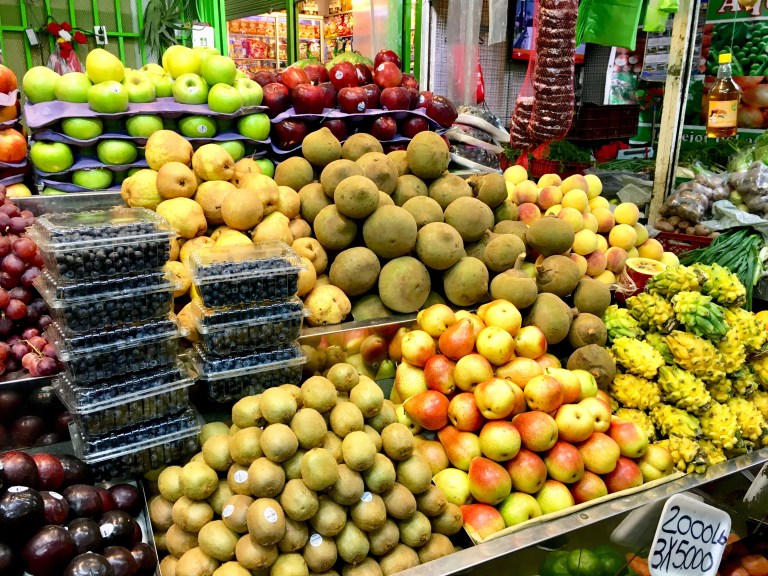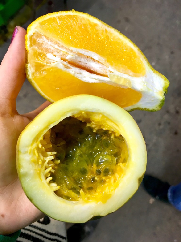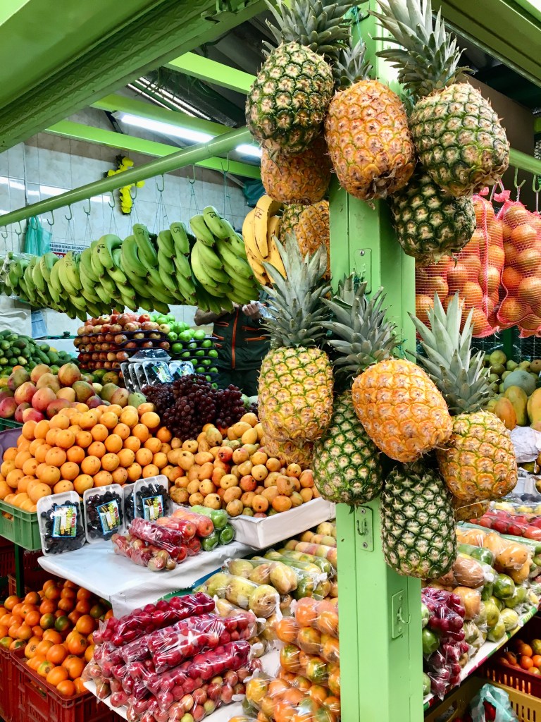 They showed me some fun new types of fruit, piles and piles of potatoes, and carrots the size of small baseball bats. I saw green onions that were at least 2 feet long and all the oranges had green rinds. I saw yellow pineapples, green pineapples, and branches drooping with mini green bananas. I saw displays with the comically small Haas avocados (popular in the States) next to the large, pear-shaped avocados, which were at least twice the size of their petite counterparts.