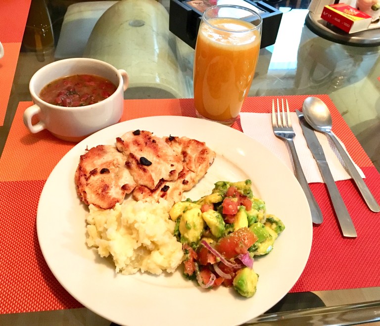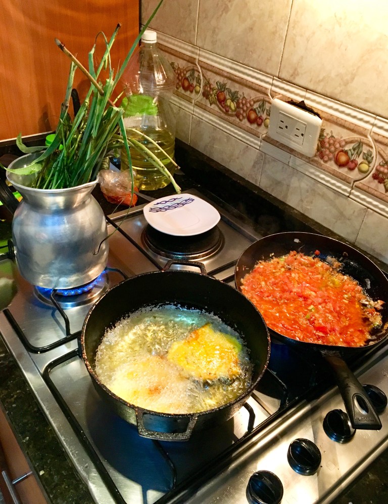 We made a salad that had onions, tomatoes, avocado and cilantro, and then prepared the chicken with garlic and oil. The tea was delicious and perfect for such a rainy day. We made mashed potatoes and fried arepas. At this point, everything smelled like garlic and onions. I was thinking we would make the arepas that you grill on the stove, but these were soooo tasty (like all fried foods, I suppose haha).