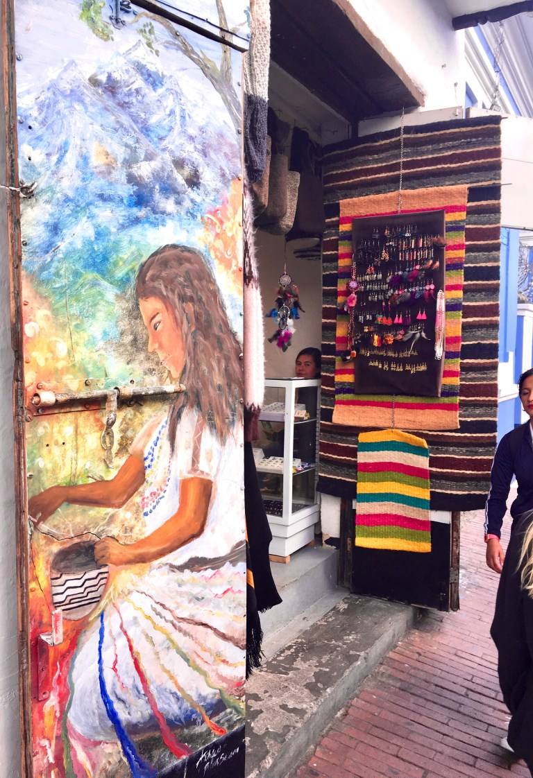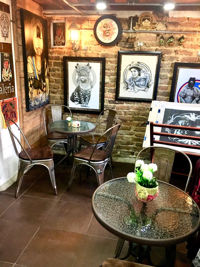 He also, in the middle of a sentence, ate some coca leaf powder, placing it in the side of his mouth and rolling his eyes back in his head and MOANING as us three watched in horror and fascination. He didn’t tell us what the powder was. I asked the gal at the counter afterwards. She said he stores his little jar of powder here to eat after the tours. The cafe was super cool with paintings for sale and an entire mural on the upstairs wall. The cafe was great. The tour guide was bizarre. I was so glad when it ended.