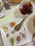 The mushrooms looked delectable, and the garlic was a quarter of the size of normal garlic cloves. Our guide/cooking instructor, a nice gal named โNew,โ told us that we could eat the thin paper surrounding these small garlic cloves, so no need to make a fuss trying to peel them. She showed us the sesame oils and palm oils that they use. They use light, flavorless oils, as olive trees donโt grow in Thailand, so olive oil is quite expensive.