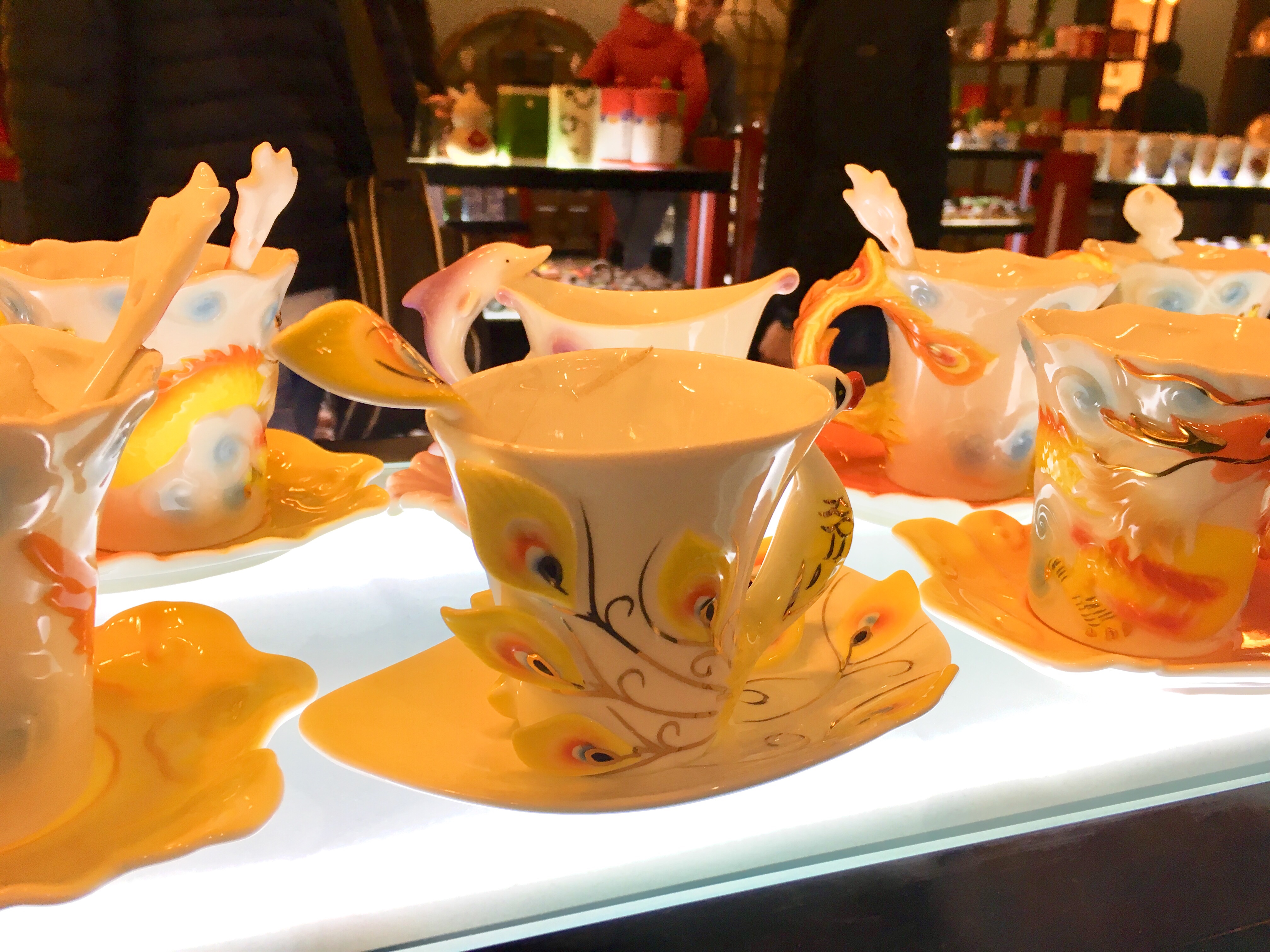 We saw so many different types of beautiful tea sets! They were red, yellow, blue, green, purple and white, some with gold trim! They sold teapots, smaller cups, larger mugs, colorful sets and designer tasting sets. I was so sad to leave this colorful rainbow of tea-ful joy!
