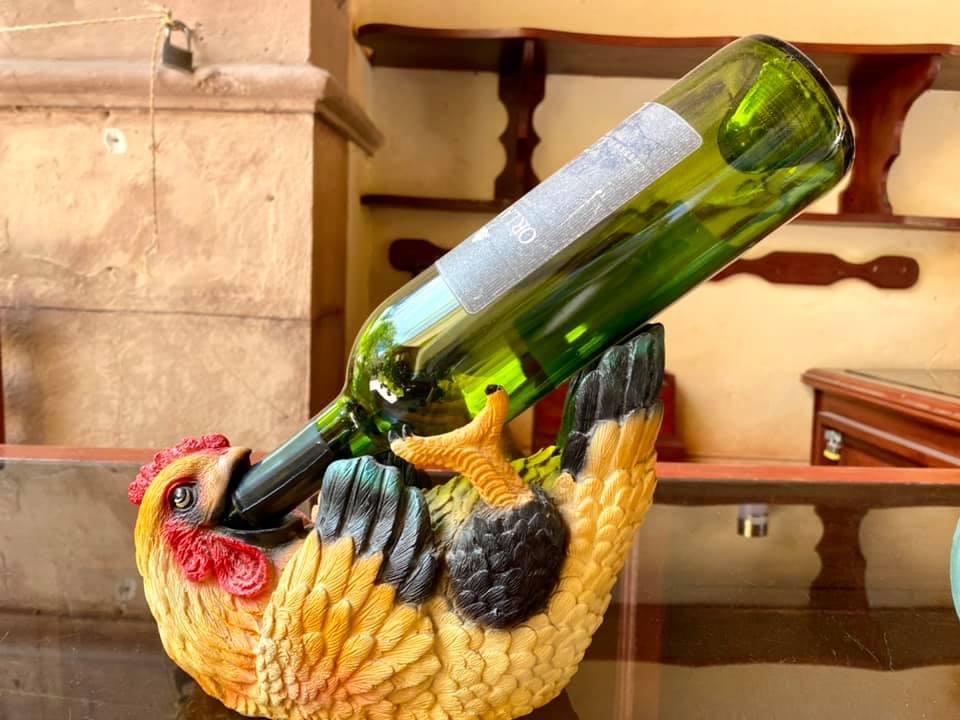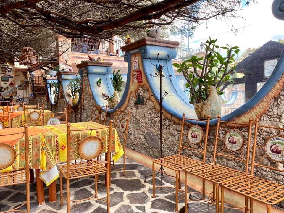It was beautiful with trees and flowers everywhere, colorful furniture painted with pain staking details, and all kinds of funny statues like a chicken gurgling on a wine bottle (but the food was less than amazing, unfortunately. Not bad, but too much food with two little flavor.)