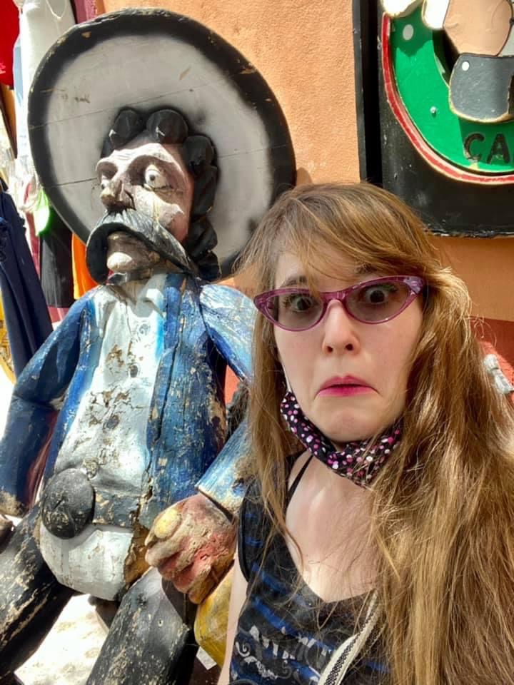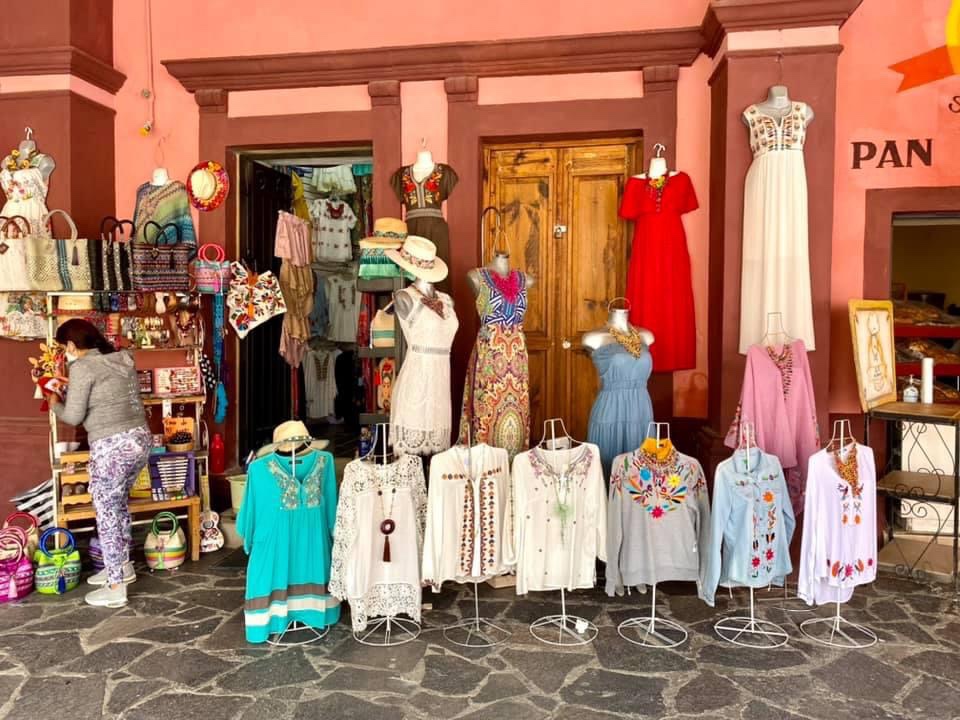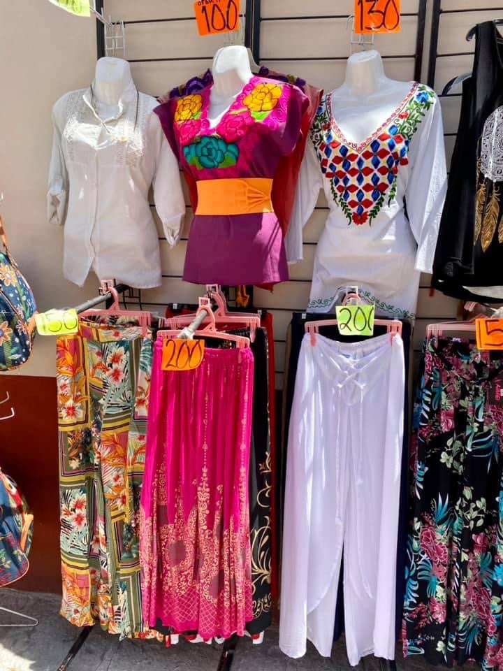 Next door, there were statues of carved life-size men made of wood, each wearing a surprised expression, an oversized mustache and a protective hat. I posed with them. 🤣 I loved the jean jackets, Frida Kahlo dresses, and mesh long-sleeve shirts, presumably to cover a swimsuit or a tank top.