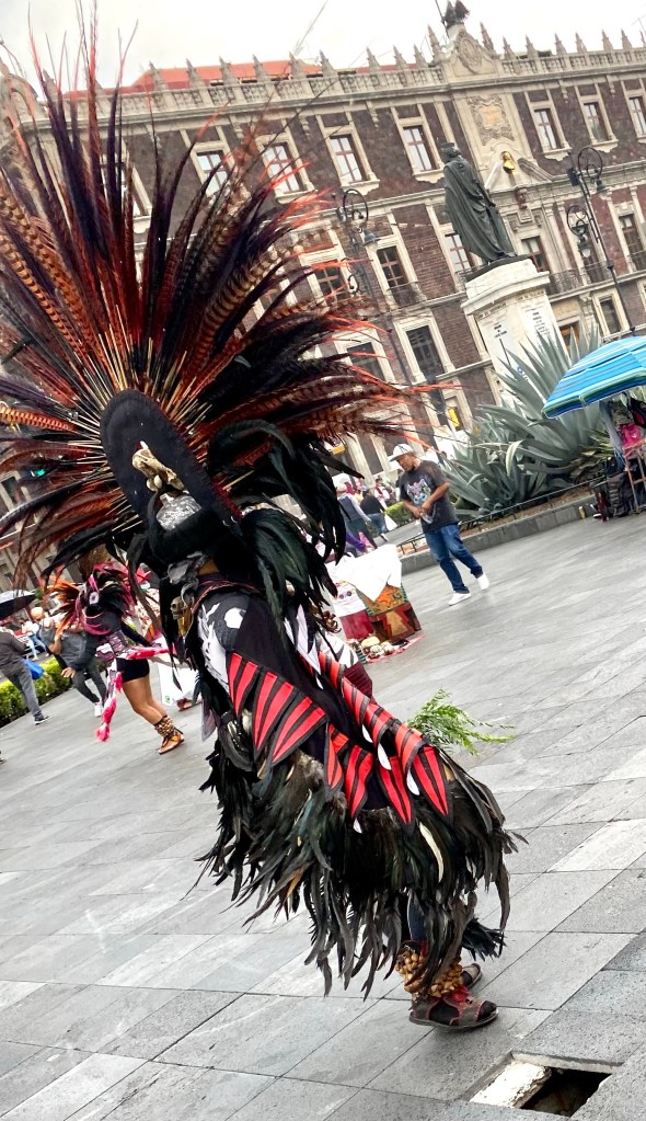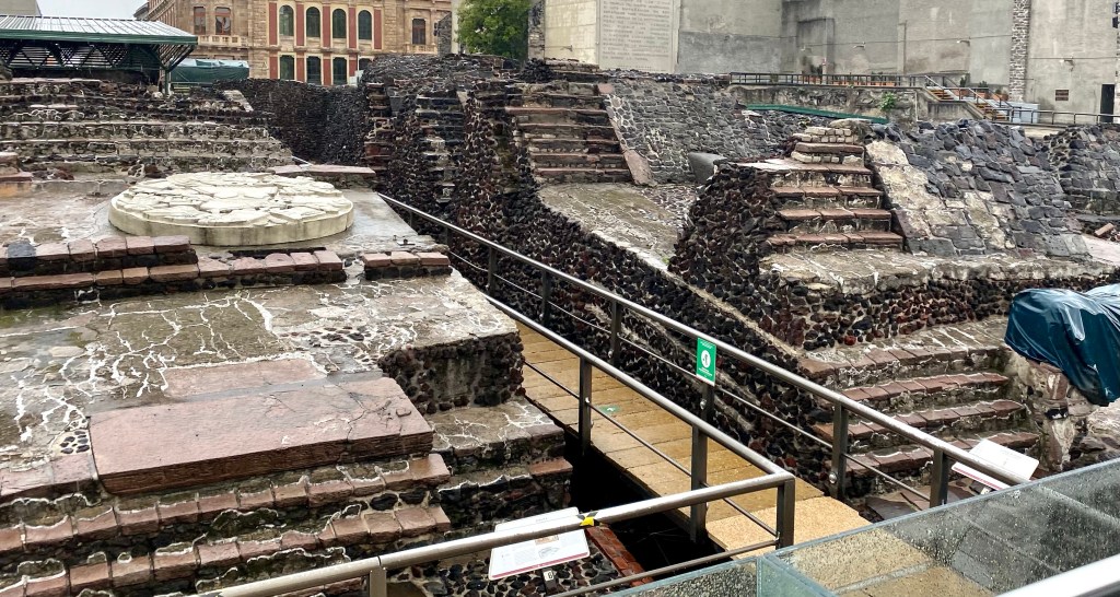 We passed by Templo Mayor, the original temple of Tenochtitlan (the city that was destroyed by the Spanish to make Mexico City). It looked like piles of ruins, dark brick stones in makeshift pyramids over this large area of the city center. They do have a huge museum, but the ruins can be seen by anyone walking past, as you have to walk over a glass walkway that lets you see all the ancient stones.