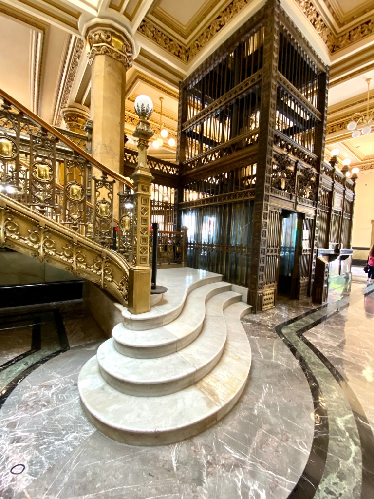 The elevator looks like a movie prop from Knives Out, and the large columns and bright, barred windows make you feel very important for being in their presence haha