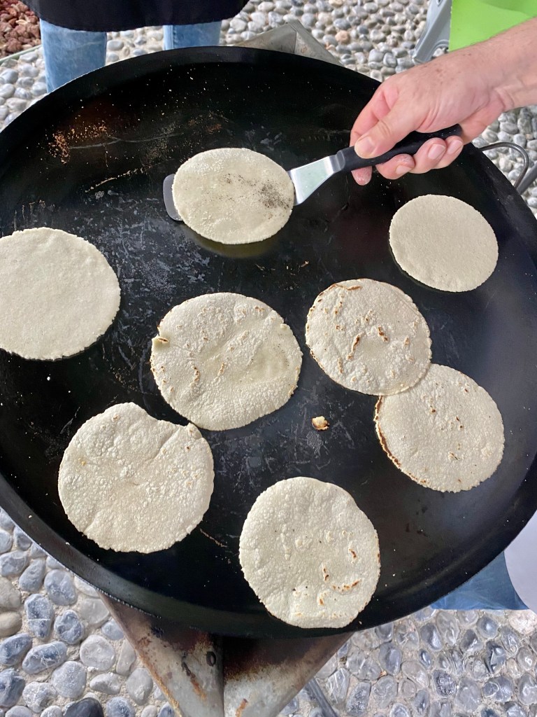 The tortillas were made from corn, the traditional kind, so they weren’t sticky or chewy, but had more of an earthy flavor and crumbly texture. We practiced making tiny balls with the dough, smooshing them with the tortilla maker, and rolling them onto the steaming hot grill. Sometimes it was more like slapping, but we tried to be gentile.