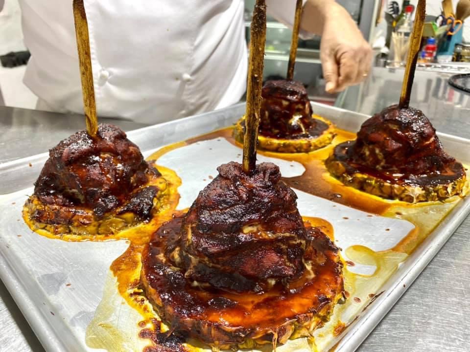 We piled the meat on a stick in order to mimic a kabab stand turn-style roasted meat display, and stuck the stick into a giant piece of carved pineapple. We brushed the adobo sauce on with a paintbrush as it dripped off the edges, catching it with the edges of our brush as not to waste the red-gold.